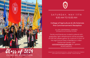 Save the date! On Saturday, May 11th, from 8:30-10:30 AM, the College of Agriculture & Life Sciences Pre-Commencement Reception will take place. Family and friends are invited to arrive with graduates, light refreshments will be provided. At 9:30 AM, please gather for a picture in front of the Agricultural Dean’s residence in Allen Centennial Garden.