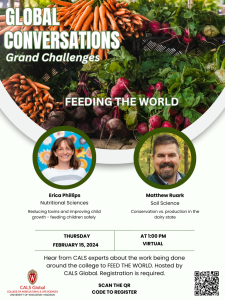 Global Conversations: Grand Challenges is a monthly virtual seminar series held on the third Thursday of every month at 1 PM. These sessions feature CALS experts whose work is being used to confront a global grand challenge. All sessions are recorded, past sessions can be viewed here. Each academic year the focus is on a different grand challenge, this year the theme is ‘Feeding the World’. All are welcome to attend and registration is required.