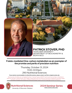 Join us this Thursday, October 31st from 11-12pm for Patrick Stover’s seminar titled “Folate-mediated One-carbon metabolism as an exemplar of the promise and perils of precision nutrition”. #seminarseries